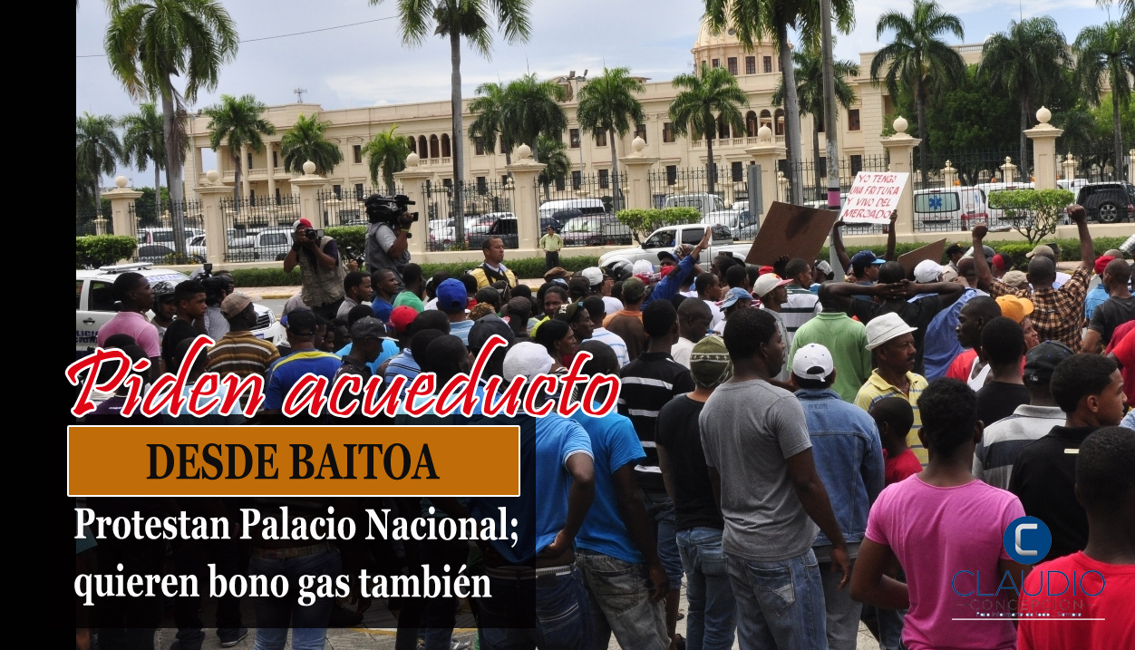 SANTO DOMINGO.- Las protestas y reclamos en los alrededores del Palacio Nacional continuaron hoy con la presencia de familias del municipio de Baitoa, en Santiago, quienes demandan del Gobierno que incluya en el presupuesto de 2015 la construcción de un acueducto, debido a que llevan más de 35 años sin recibir el líquido.