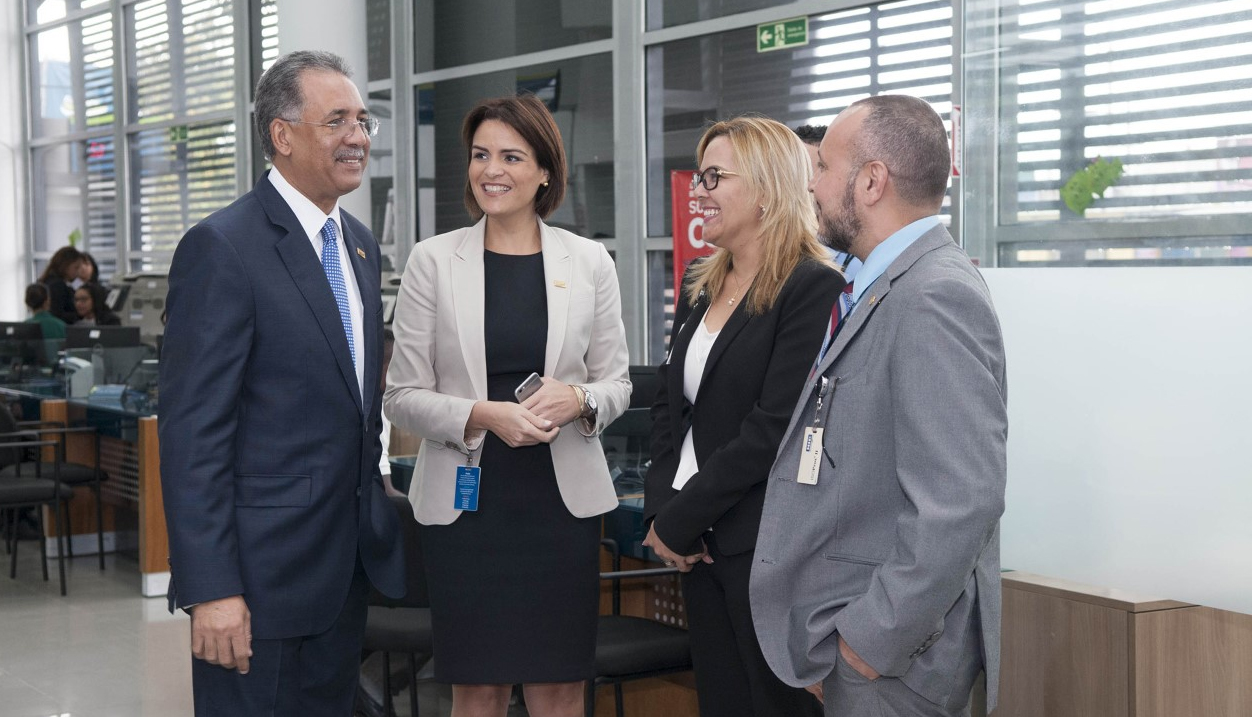 El administrador general de Banreservas, Simón Lizardo Mézquita, visita la oficina Charles de Gaulle de la entidad financiera. Lo acompañan Mirjan Abreu, directora general de Negocios Personales; Lorenza Bencosme, directora regional zona Oriental, y Rafael Rodríguez, gerente de esa sucursal.