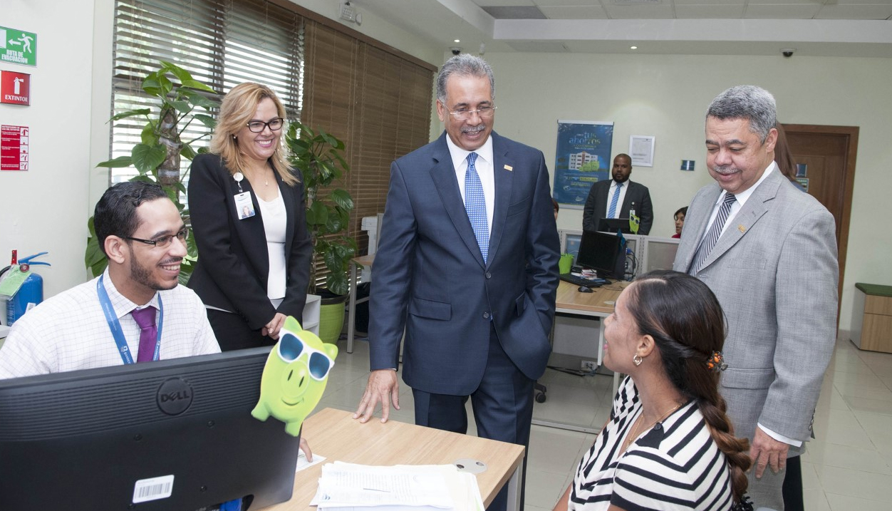 El administrador general de Banreservas, Simón Lizardo Mézquita, conversa con una clienta de la oficina Sans Soucí, durante su primer recorrido por centros de atención a clientes. Observan Lorenza Bencosme, directora regional zona Oriental y Orion Mejía, director general de Relaciones Públicas del Banco.