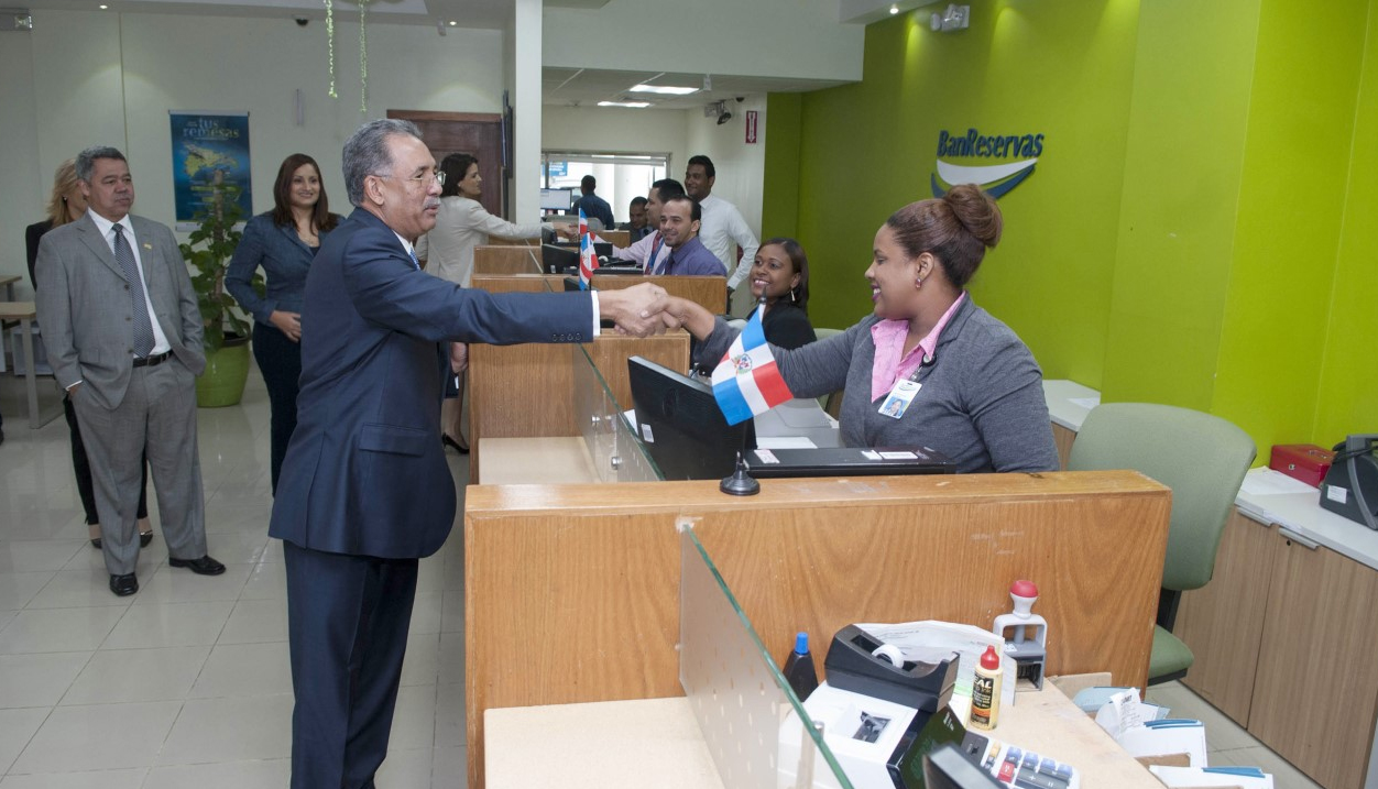 El administrador general de Banreservas, Simón Lizardo Mézquita, conversa con los cajeros de la oficina Sans Soucí.