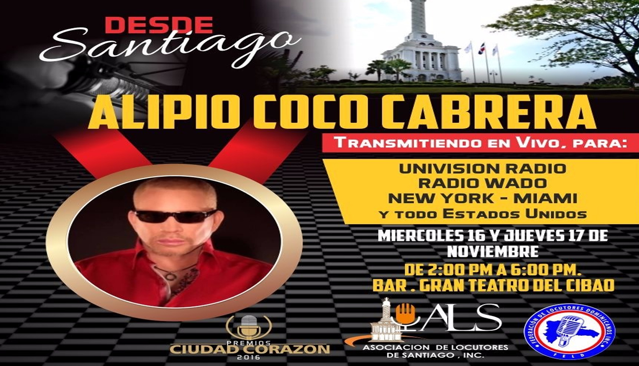 El reconocido locutor dominicano radicado en la ciudad de Nueva York, Alipio Cocco Cabrera, con motivo a la celebración de los Premios Ciudad Corazón, realizará la transmisión en vivo desde el Bar del Gran Teatro del Cibao, de su popular programa El Palo con Cocco, el cual se transmite por Radio Wado 1280 Am para toda la unión americana, teniendo gran incidencia en Nueva York, Nueva Jersey, Miami, Boston, Pensilvania y otras grandes ciudades de mucha concentración de hispanos.