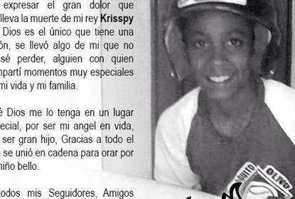 Falleció en la mañana de hoy sábado el niño Krisspy de los Santos, de once años de edad, hijo del merenguero típico conocido como El Krisspy. El deceso del niño se produjo a las 11:00 de la...Que le entreguen el anfiteatro Nuryn Sanlley a la periodista!!!!