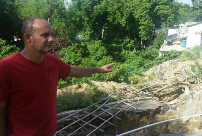 Joel Núñez señala la parte donde se produjo el derrumbe que aún no comienza a ser solucionado. SANTIAGO.- Residentes en la calle Primera, del sector santiaguero de Villa Verde, donde el derrumbe...Venden alimentos al lado de basureros