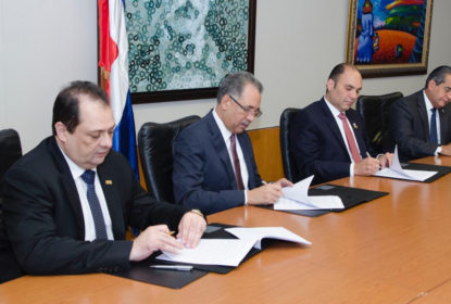 El administrador general de Banreservas, Enrique Ramirez Paniagua, y el tesorero nacional, Alberto Perdomo Piña, firman el convenio entre ambas instituciones, junto al ministro de Haciendas, Simón...Reclaman reparación calle afectó derrumbe