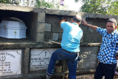 Instante en que son colocados en las bóvedas del cementerio de Los Cagüeyes, de Jánico, los restos de Juan Isidro y sus hijos Fefri y Yandeili Quezada Ceballos. SANTIAGO.- El interés de rescatar...Rescatan los dos cadáveres restantes ahogamiento de familia