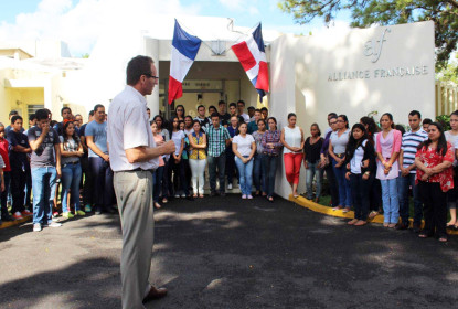 Cyril Anis, director ejecutivo de la Alianza Francesa de Santiago y estudiantes de la institución mientras guardaban un minuto de silencio por las víctimas de los atentados de Paris. SANTIAGO.-...Cuatro muertos en menos de 24 horas en Santiago