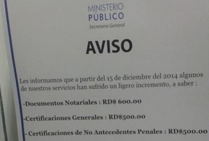 SANTO DOMINGO.- El Ministerio Público informó que a partir del 15 de diciembre del 2014 algunos de los servicios que ofrece han sufrido un «ligero» incremento. Un comunicado colocado en oficinas...Salud Pública pide a la población no usar fuegos artificiales en festividades navideñas