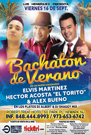 “El Bachatón del Verano” es un concierto bailable que se llevará a cabo el 16 de septiembre en el Robert Treat Hotel de Newark, Nueva Jersey. Allí El Torito, Elvis Martínez y Alex Bueno brindaran lo mejor de su repertorio para complacer a un público de diversas nacionalidades y que está concentrado en celebrar el 206 aniversario de la independencia mexicana, país que ha dado un soporte importante a la bachata en Estados Unidos y a los artistas dominicanos.