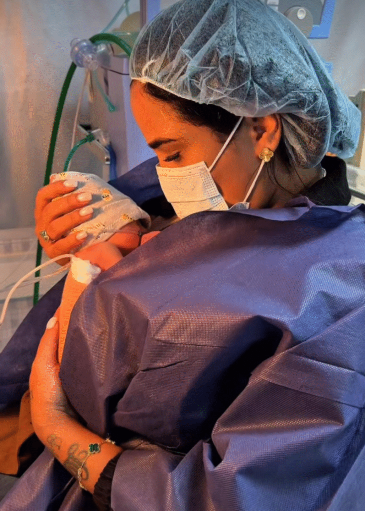 «Después de 9 días por fin pude cargar a mi bebé. Gracias a Dios, al equipo médico y a las oraciones de todos ustedes, va mejorando», escribió en su publicación más reciente.