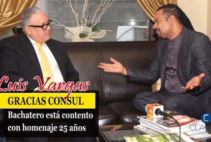 NUEVA YORK.- Momento cuando el licenciado Luis Lithgow, a la izquierda, informaba al bachatero Luis Vargas sobre el homenaje que le tributará en ocasión de la celebración de sus 25 años en el...