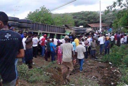 Residentes en Judea de Montecristi al momento de ocurrir el accidente donde murió aplastado el conductor de una patana cargada de guineos. Foto Santiago Ureña SANTIAGO.- El chofer de una...Esperan que mujer reviva, se resisten darle sepultura