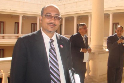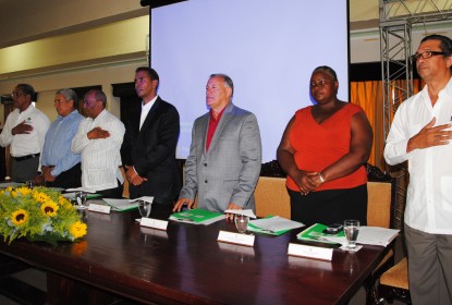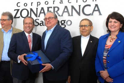 Los empresarios Carlos Fondeur, Miguel Lama y María Victoria Menicucci, junto al presidente del Senado, Reinaldo Pared Pérez, observa monseñor Agripino Núñez Collado, rector de la PUCMM....Protestan en Navarrete por segundo día por traslado dirigente popular a cárcel Higuey