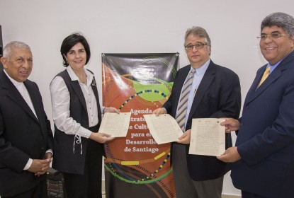Monseñor Ramón Benito de la Rosa y Carpio, María Amalia León de Jorge, Carlos Fondeur y Fernando Rosa, muestran el documento firmado. SANTIAGO.- Con el objetivo de formular la agenda...