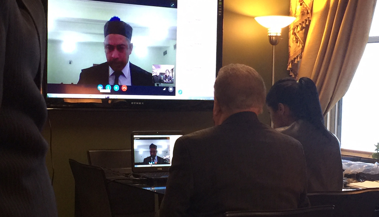 NUEVA YORK.- Una vista de la Videoconferencia donde figuran en la sede consular, de espaldas, el cónsul general arquitecto Eduardo Selman y la dominicana que ofreció su testimonio al ser interrogada sobre un homicidio desde un tribunal en el Distrito Nacional, República Dominicana.