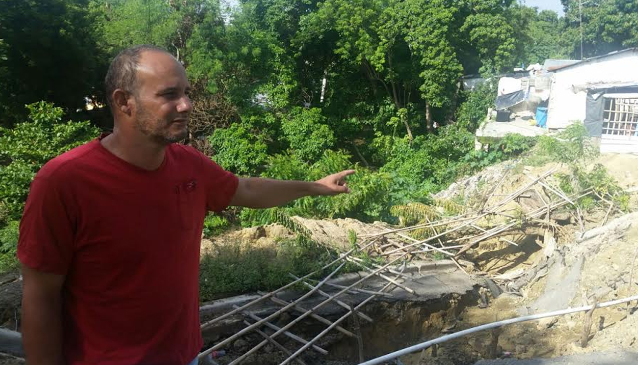 Joel Núñez señala la parte donde se produjo el derrumbe que aún no comienza a ser solucionado.